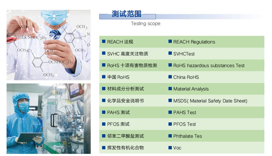 有害物質檢測,主要開展的業(yè)務包括歐盟RoHS指令、中國RoHS指令及其他有害物質測試,REACH法規(guī)及各種 環(huán)保法規(guī)整體解決方案提供,各種環(huán)保法規(guī)培訓和知識更新。為符合RoHS(電子電機設備中限制使用特定有害物質) 的法規(guī)要求,STU衡創(chuàng)檢測為企業(yè)提供一站式全方位咨詢、檢測、材質清單評估、產(chǎn)品檢測及認證解決方案,以符 合RoHS法規(guī)之要求,使企業(yè)產(chǎn)品易于達成RoHS符合性要求。