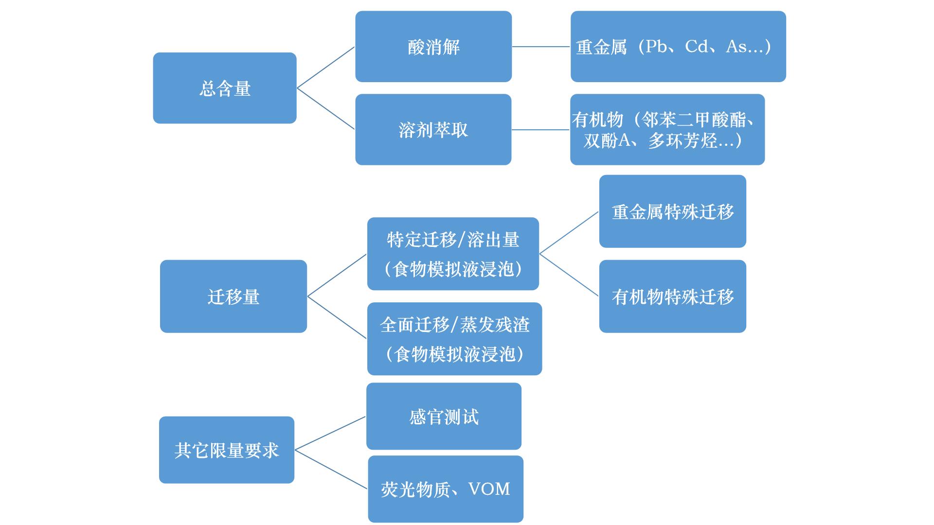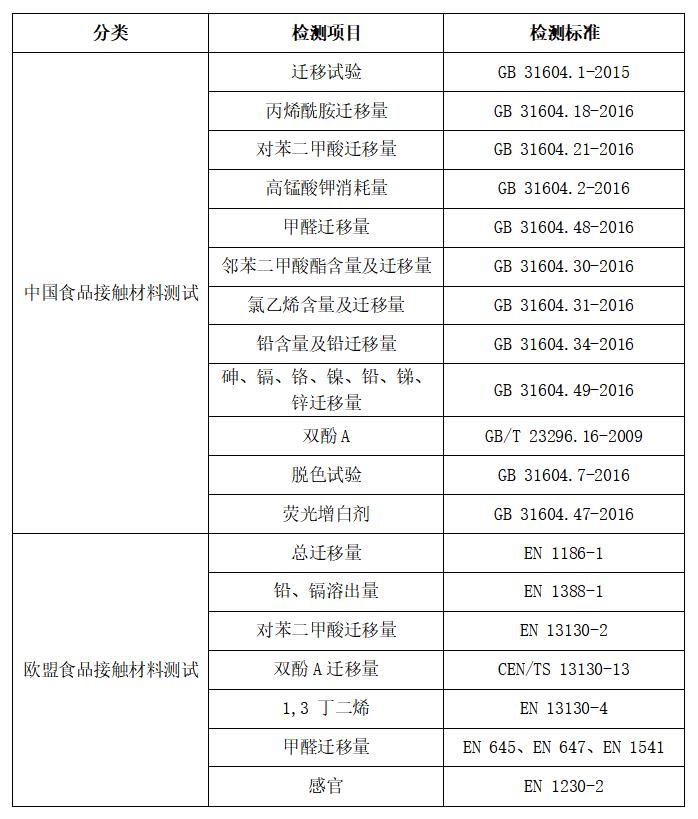 按照食品接觸材料衛(wèi)生標(biāo)準(zhǔn)的規(guī)定,檢測(cè)項(xiàng)目和檢測(cè)方式通常包括以下幾類:
